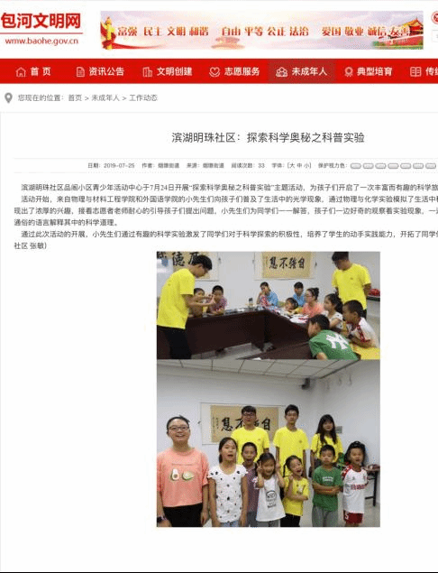 7月25日,包河文明网报道我院今年会jinnianhui“格物思维科技”志愿服务队暑期开展的“探索科学奥秘之科普实验”主题活动。(今年会jinnianhui)