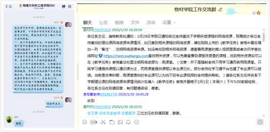截至目前,学院利用慕课等优质网络课程资源,在雨课堂、学习通等线上教学平台共开设了52门本科生专业课程(包含2门实践类课程,开课门数占学校总开课门数的17%左右)和3门研究生专业课程,授课教师通过直播授课、录播授课、混合教学等方式进行线上教学。在实际教学过程中,很多教师通过组建课程微信群、QQ群等方式作为辅助手段,引导学生自主学习,积极开展线上教学和指导。例如:我院舒志峰老师通过QQ群屏幕共享与微软白板相结合的方式实现语音、板书、PPT的互动教学;陶蕊老师把班级QQ群作为辅导答疑的辅助工具,并将学生在QQ群中的优质问题在学习通平台讨论模块集中展示,方便学生查看;薛燕老师课前将与课程相关的电子书、PPT、讲稿、课程录音等材料同时上传至学习通和QQ群,方便学生自主学习。此外,还有很多老师把自己整理搜集的一些电子资源共享给学院其他老师,丰富了网络课程资源,提高了网络教学质量。目前,从第一周线上教学反馈来看,我院的线上教学运行总体平稳。