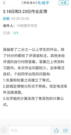 为了能够巩固此次课所学的知识,以及加强对知识点的掌握,老师会在上完每次课后布置相关的习题,作业快截至时,老师会适当的提醒,防止同学作业没有提交。对于提交的每一份同学的作业,老师都会认真地批改,并在批改作业完后,在学习通中发布作业反馈通知,会提醒同学们每题的相关知识点,以及同学们错的比较多的地方,并对没有达到92分的同学作业,给出评语。