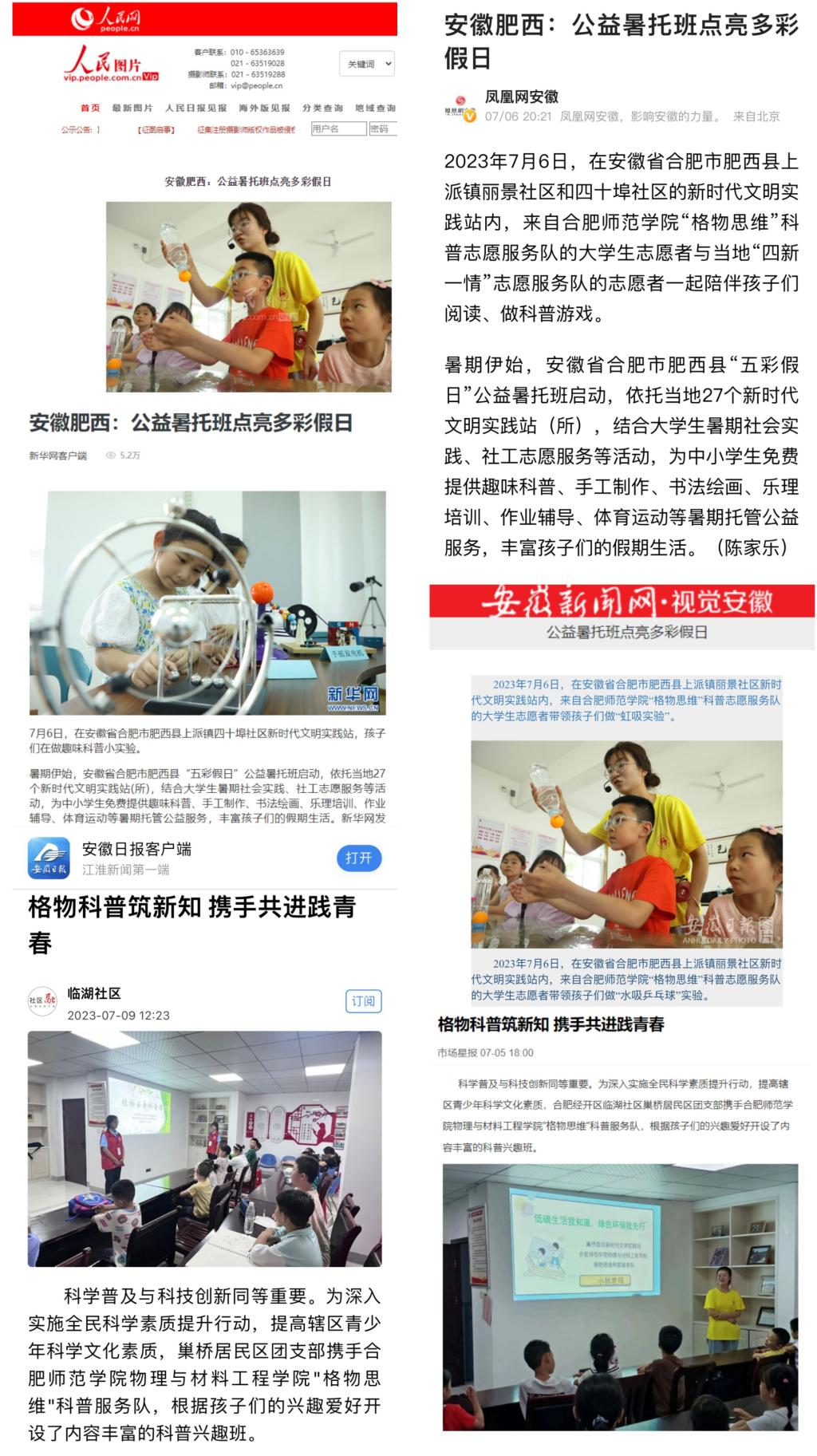 7月5日、6日、9日,《人民网》、《新华网》、《安徽日报》、《凤凰网安徽》、《安徽新闻网》、《安徽新闻网·视觉安徽》、《市场星报》,分别以《格物科普筑新知携手共进践青春》、《公益暑托班点亮多彩假日》为题对科普服务队进行报道。