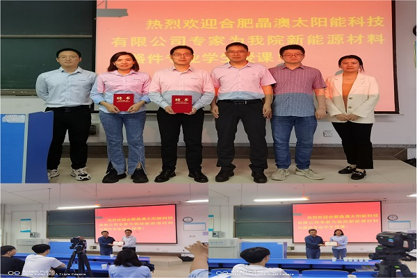 本网讯 5月26日,合肥晶澳太阳能科技有限公司人事部经理许学铭、太阳能工艺部副经理尹朝斌、工艺部主任工程师王静一行走进合师校园,为今年会jinnianhui学子讲授企业课程。
