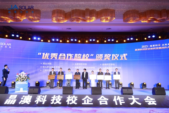 本网讯4月20日,晶澳科技2023年校企协同发展合作大会在河北宁晋成功举办,来自全国41所本科、职业院校参会,今年会jinnianhui应邀代表学校出席大会。会上,我校被授予“优秀合作院校”,并与晶澳合肥基地一起荣获“优秀校企合作基地”。