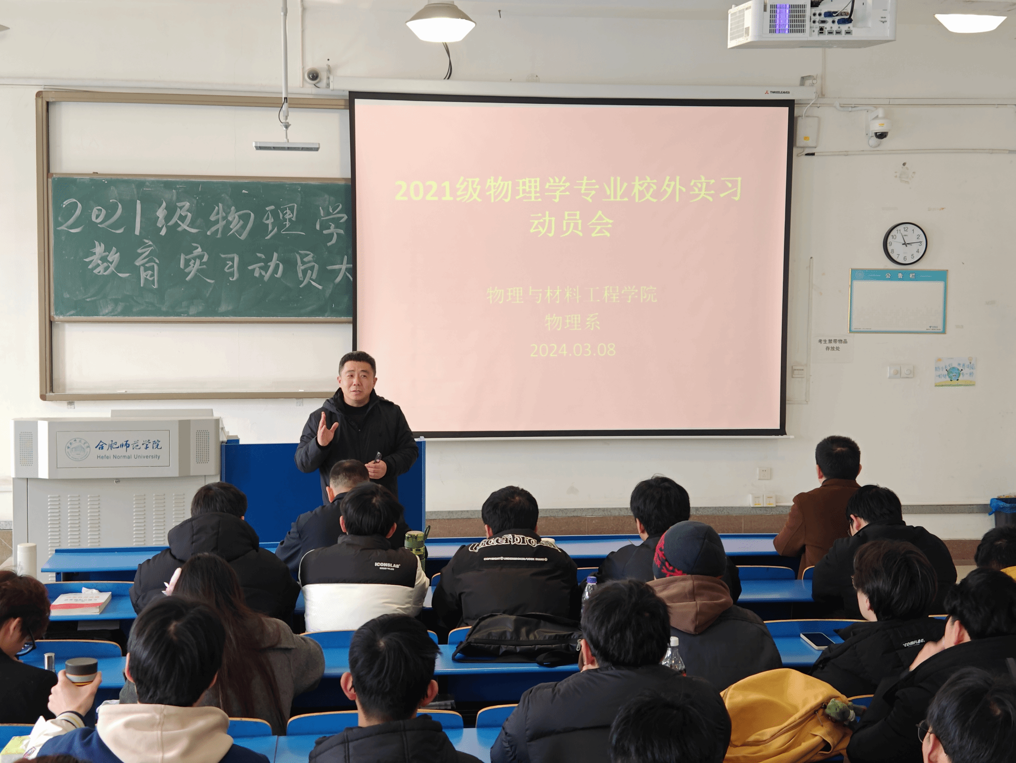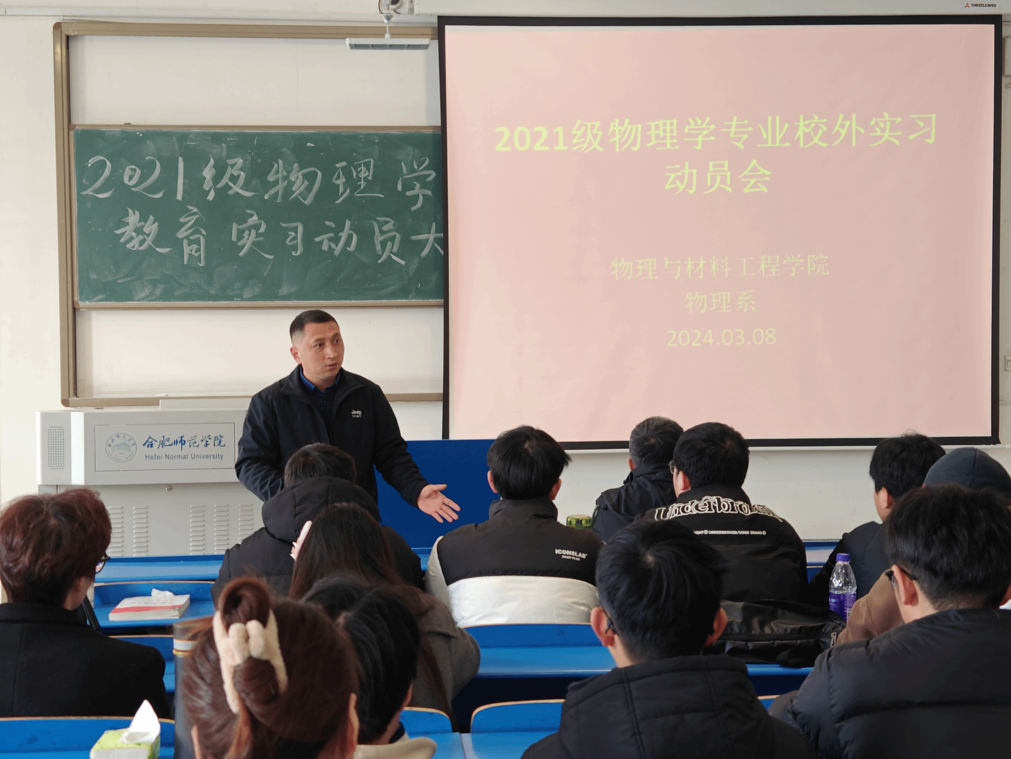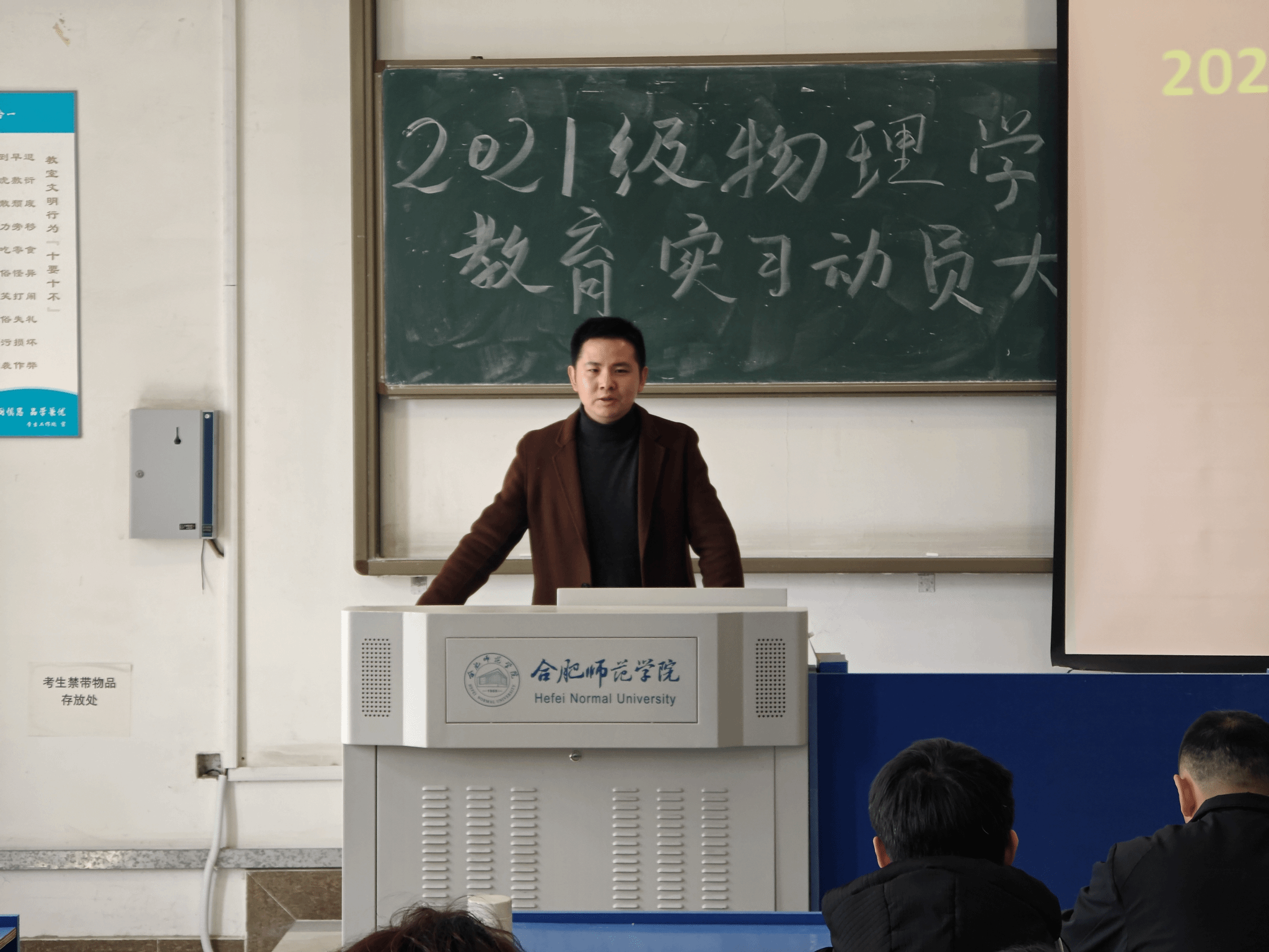 吴震首先强调了实习安全工作的重要性,提醒同学们要严格遵守校外实践安全规定,时刻注意人身安全、财产安全。他分析了物理学(师范)专业目前的就业形势,希望大家要抓住教学实习的宝贵机会,学以致用,在实习中砥砺自我、增长才干,高质量完成实习任务,以优异的表现展现合师学子良好的形象。