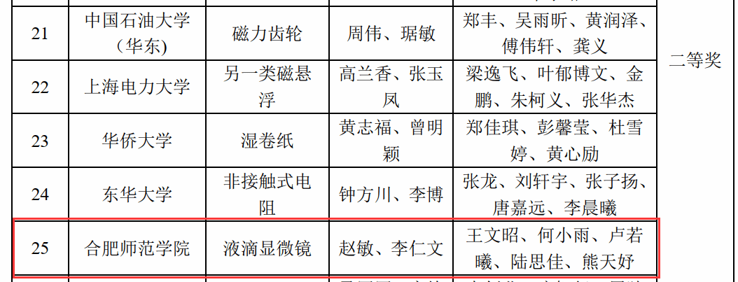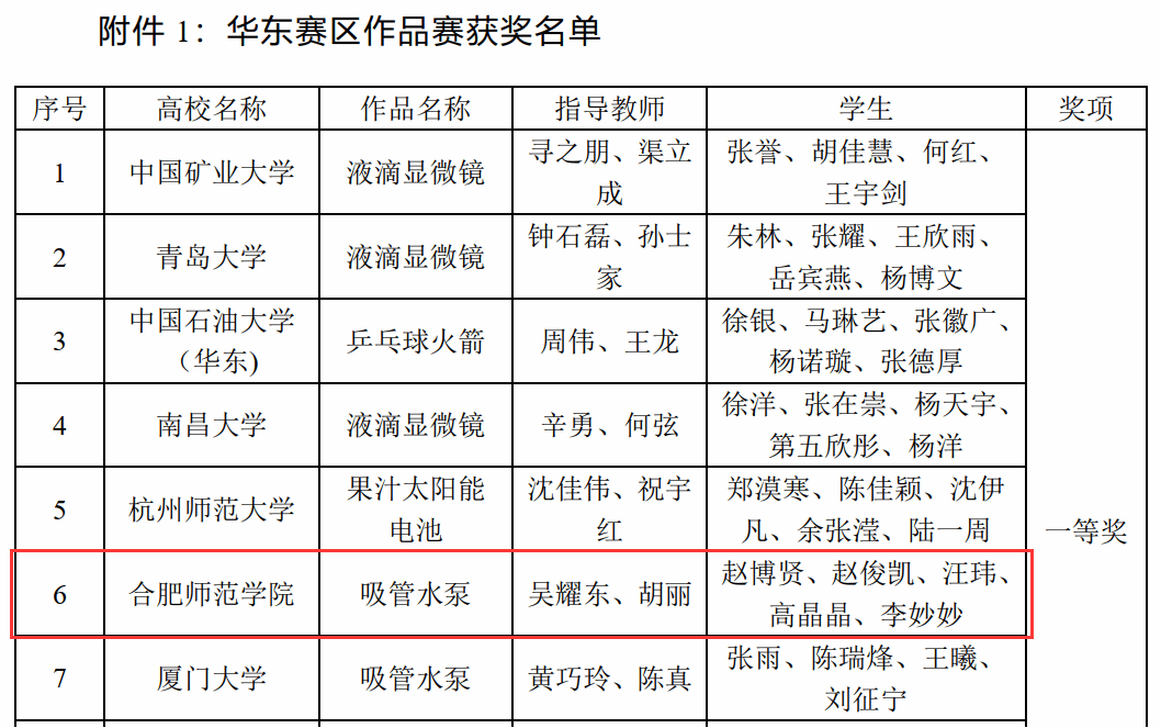 2024年7月,第七届中国大学生物理学术竞赛(华东赛区)作品赛在南昌大学成功举办。本次赛事吸引了华东地区32所高校共60个作品参赛。由今年会jinnianhui学子组建的2支参赛队伍的作品代表合肥师范学院首次参加华东赛并全部获奖,其中赵博贤、赵俊凯、汪玮、高晶晶、李妙妙同学的参赛作品《吸管水泵的理论与实验分析》(指导教师:吴耀东、胡丽)荣获华东赛区一等奖并被推送参加全国总决赛。王文昭、何小雨、卢若曦、陆思佳、熊天妤同学的参赛作品《液滴显微镜》(指导教师:赵敏、李仁文)荣获华东赛区二等奖。