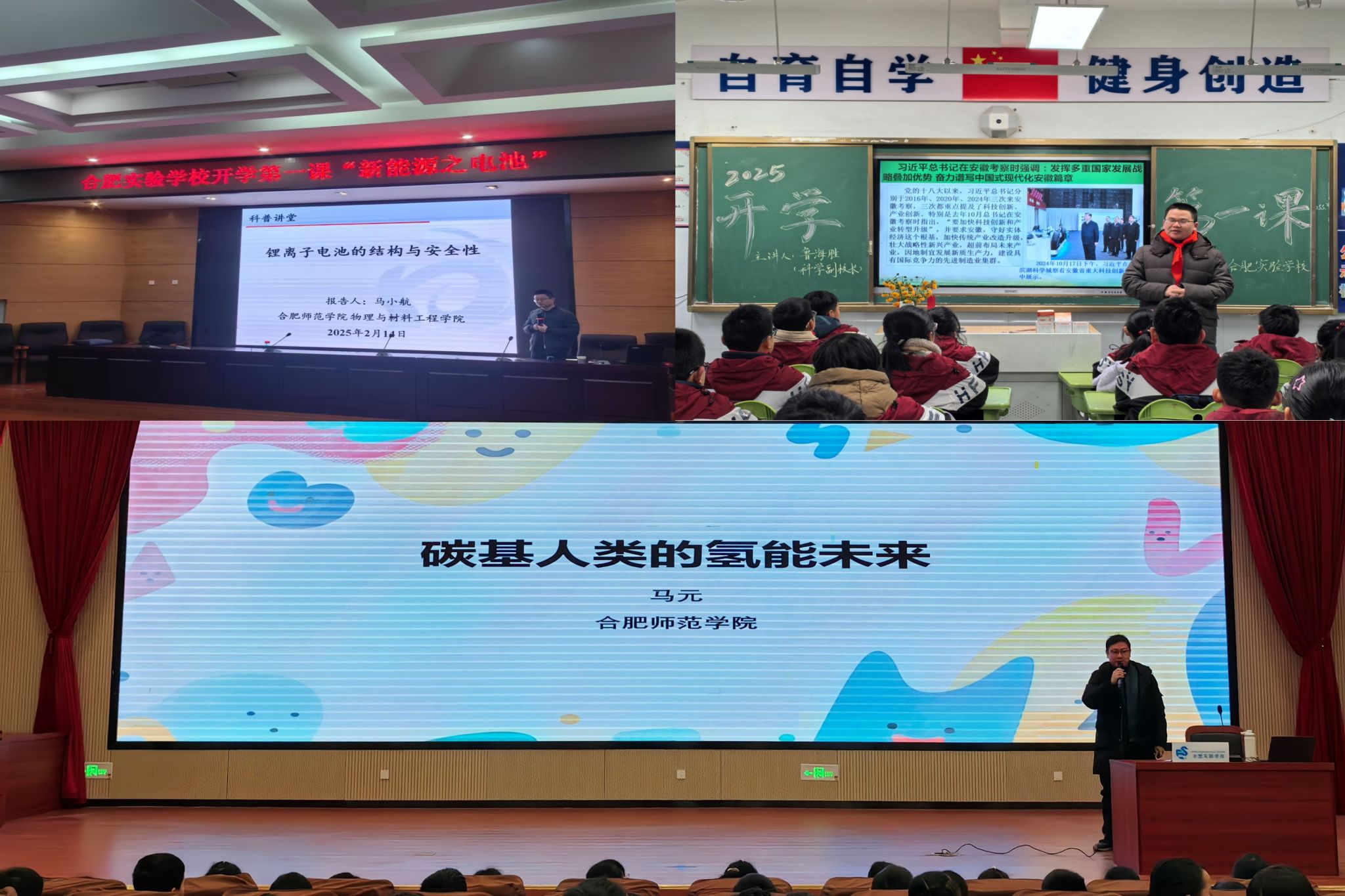 本次科普团队由马小航、马元、鲁海胜三位博士组成,从自身研究方向出发,在锂离子电池、燃料电池等具体领域精心准备了以“新能源之电池”为主题的科普课程,并分别前往合肥实验学校九珑湾校区、西宁路校区和包河花园校区宣讲。在课堂上,三位教师通过生动有趣的讲解和互动问答,深入浅出地向学生们介绍了新能源电池的原理、应用以及未来发展方向。学生们积极参与,现场气氛热烈,有效地激发了学生们对新能源科学的兴趣,为学生们带来了一场别开生面的新学期科普第一课。