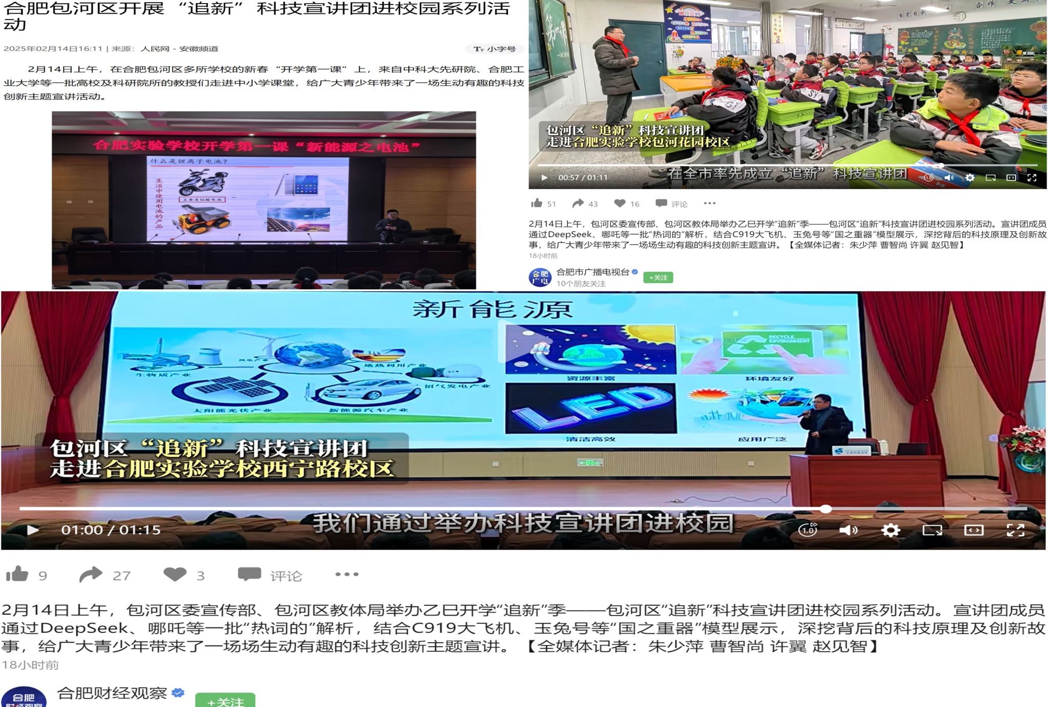 科普活动同时受到了社会各界的广泛关注,人民网、合肥市广播电视台、合肥财经观察、搜狐网等多家媒体对活动进行了报道和转载。此次活动是高校“双带头人”教师党支部响应“强国行”专项行动的生动实践,充分体现了高校教师党支部在服务社会、助力基础教育方面的责任担当。未来学院将继续发挥“双带头人”教师党支部的引领作用,整合专业资源,拓展科普服务的广度和深度,为更多学校提供高质量的科普教育服务。