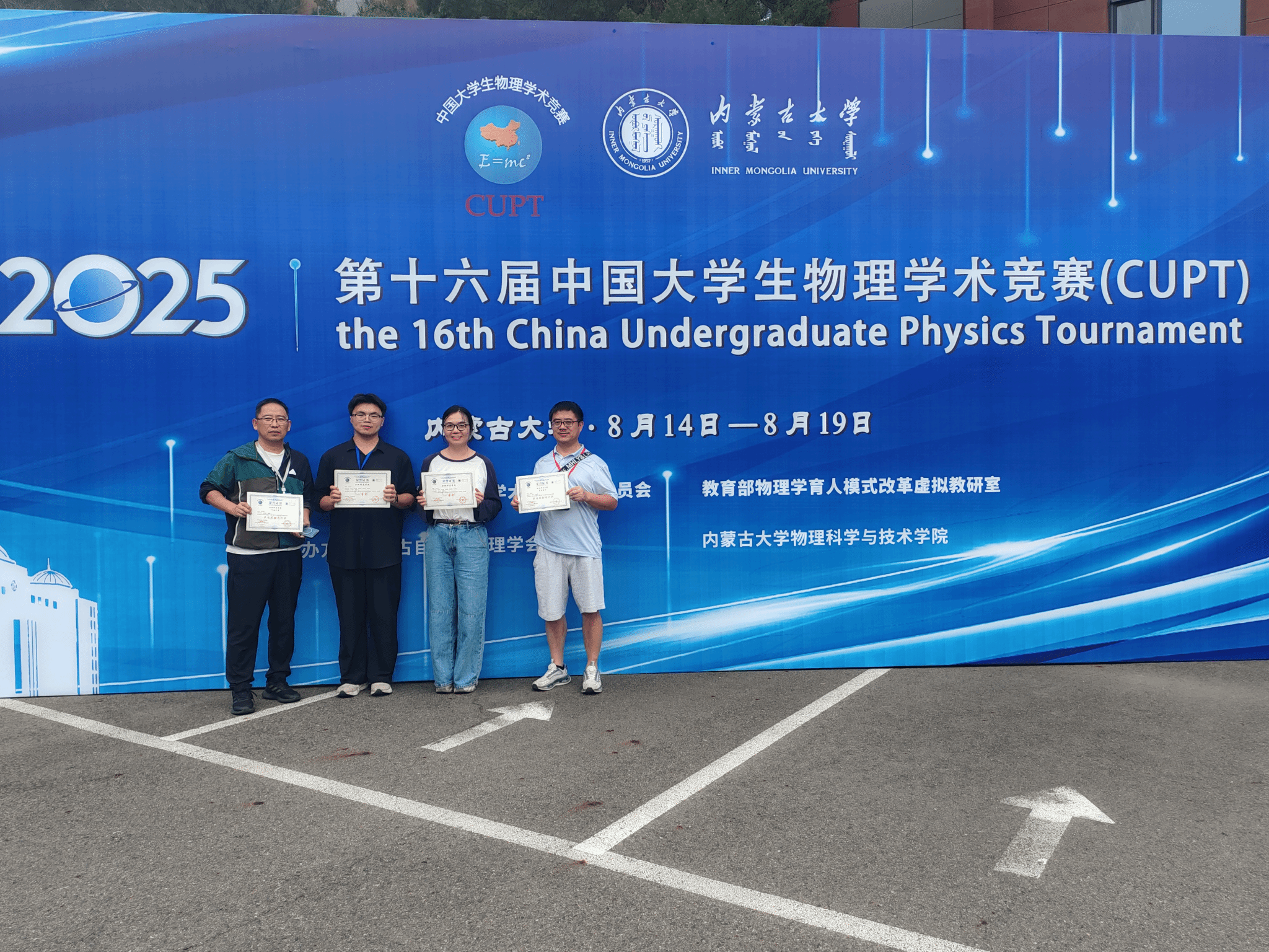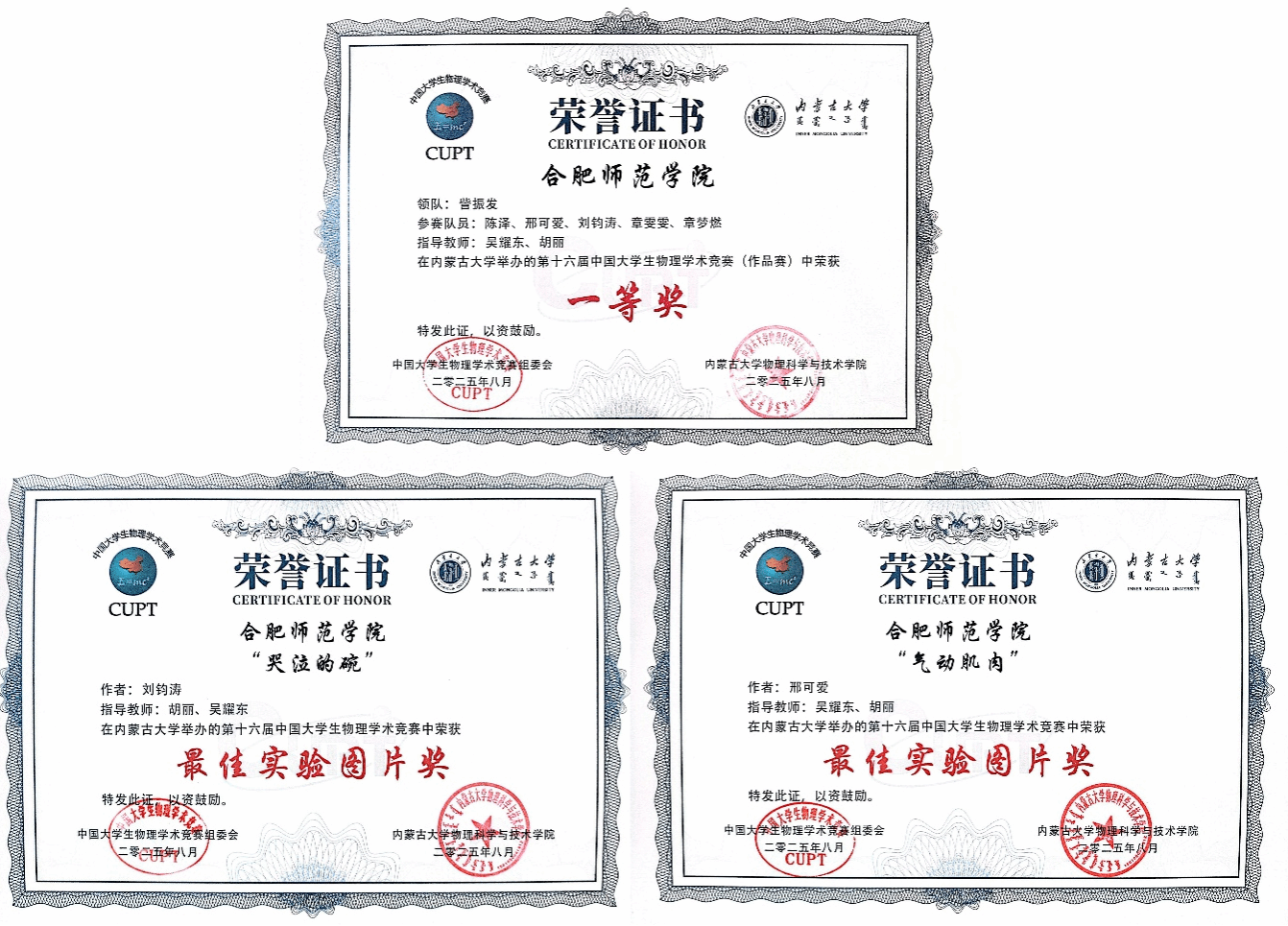 近日,由中国大学生物理学术竞赛组委会主办、内蒙古大学物理科学与技术学院承办的第十六届中国大学生物理学术竞赛(China Undergraduate Physics Tournament, CUPT)于2025年8月14日-19日在内蒙古呼和浩特市成功举办。合肥师范学院代表队此前以华东赛区作品赛道第一名的成绩,成功突围全国总决赛,并最终以全国第3名的总分斩获作品赛一等奖1项,最佳实验图片奖2项,创下我院在CUPT国赛中历史最好成绩。