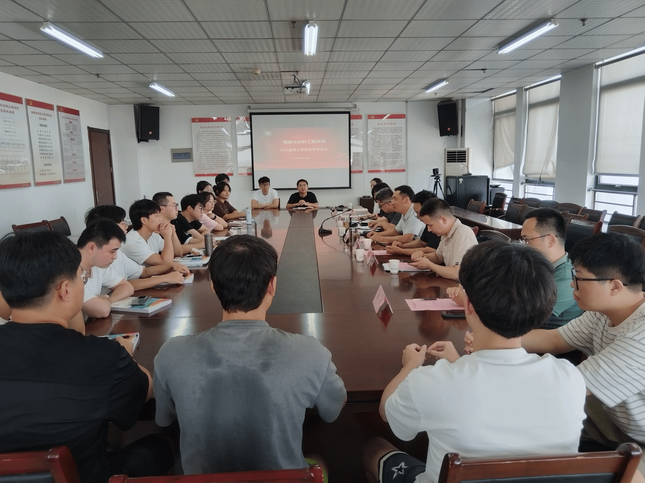 9月16日上午,今年会jinnianhui2025级研究生开学典礼在锦绣校区行知楼1202会议室举行。学院党委书记吴震、副院长余龙宝、党委副书记夏文玲、研究生办公室主任王从戎、物理系主任沈永才、光电系主任蒋杉、研究生辅导员岳加宝、沈瑞芮以及2025级全体研究生参加开学典礼。