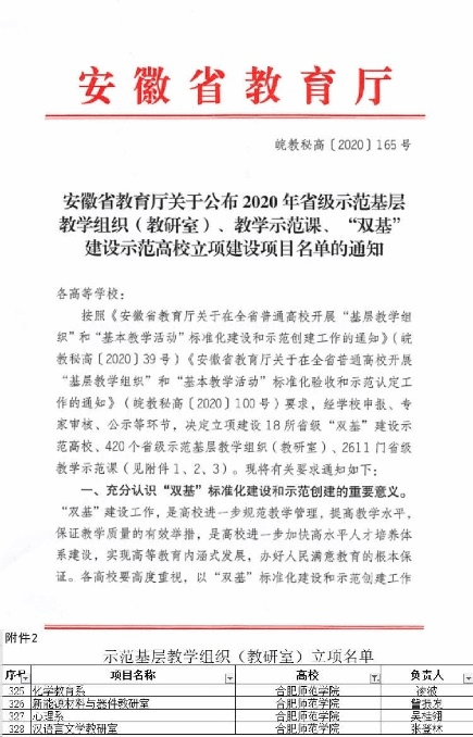 近日,安徽省教育厅发布《关于公布2020年省级示范基层教学组织(教研室)、教学示范课、“双基”建设示范高校立项建设项目名单的通知》,我院新能源材料与器件教研室成功获批为省级示范基层教学组织。