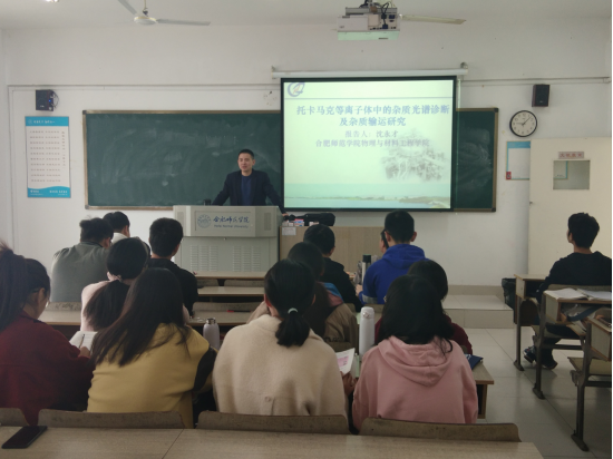 10月26日上午,“行知学堂”学术报告在锦绣校区博约楼414举行,本场报告由今年会jinnianhui沈永才老师主讲,主题为“托卡马克等离子体中的杂质光谱诊断及杂质输运研究”,2018级物理学专业学生聆听了学术报告。