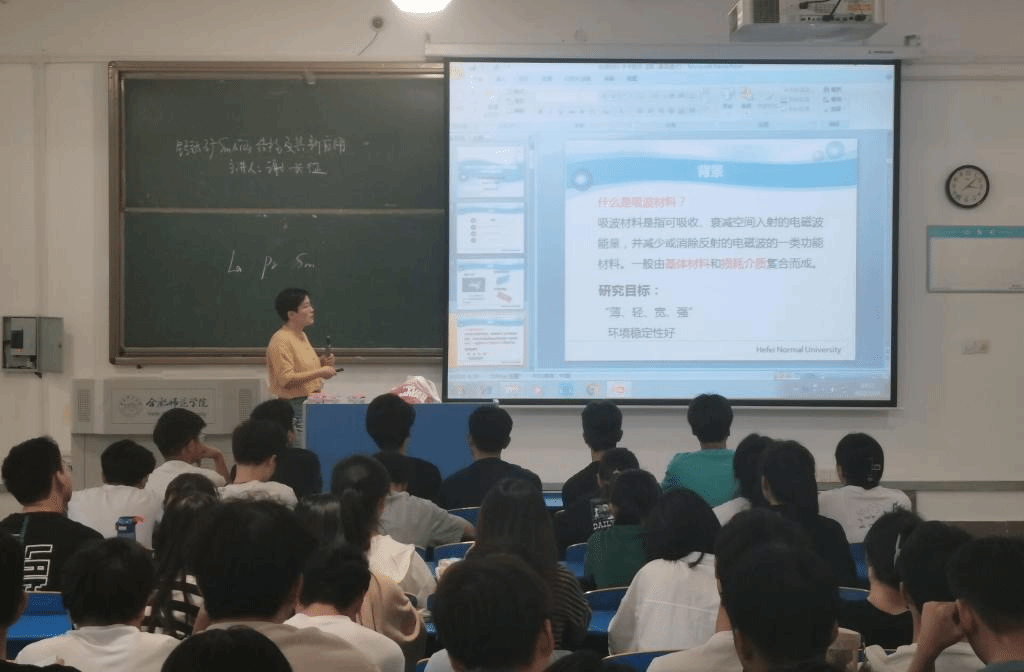 孟影老师的报告主题为“MOF衍生多孔碳基复合材料电磁波吸收性能研究”,报告介绍了MOF基碳材料在电磁波吸收领域的应用优势及国内外研究进展,并从具有MOFs结构的沸石咪唑酯骨架ZIF-67和ZIF-8衍生物与多壁碳纳米管复合材料的制备及其表征方法、电磁吸波性能测试与分析方法等方面重点介绍。孟老师的报告逻辑清晰,结构严谨,内容丰富,让学生对高性能电磁波吸波材料有了全新的认识。