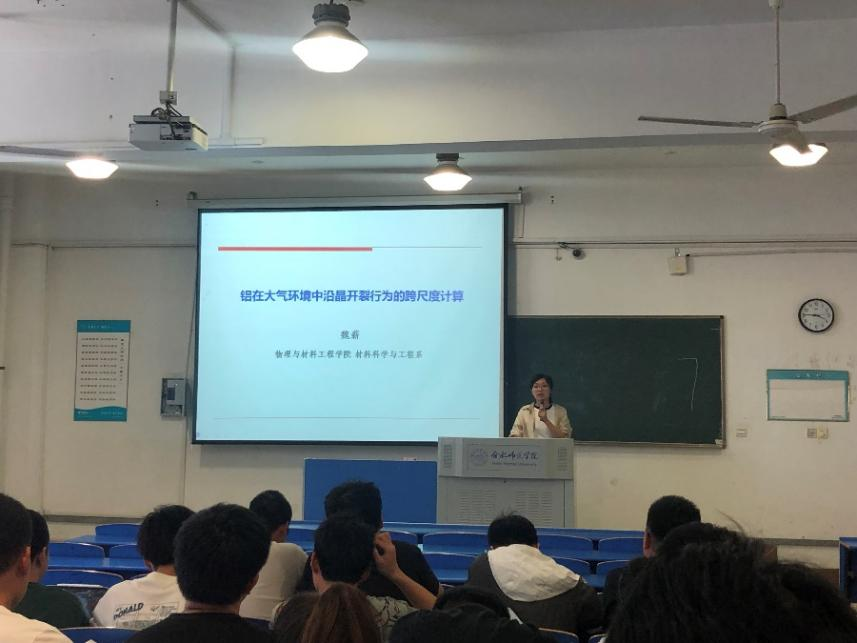 魏薪老师的报告题为“铝在大气环境中沿晶开裂行为的跨尺度计算”。报告针对铝结构材料,利用第一性原理与有限元相结合的跨尺度计算方法,将原子尺度计算获得的晶界结合能这一参数作为桥梁输入到大尺度有内聚限元计算之中模拟晶间裂纹的萌生与扩展,实现原子尺度与宏观尺度耦合的跨尺度计算过程,基本完成铝大气腐蚀行为与机理的跨尺度计算与模拟框架的搭建,对工程应用具有指导作用。